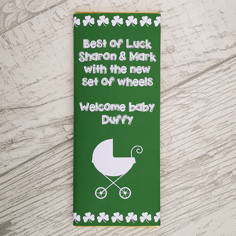 Text on bar reads “Best of Luck with the new set of wheels. Welcome baby”.