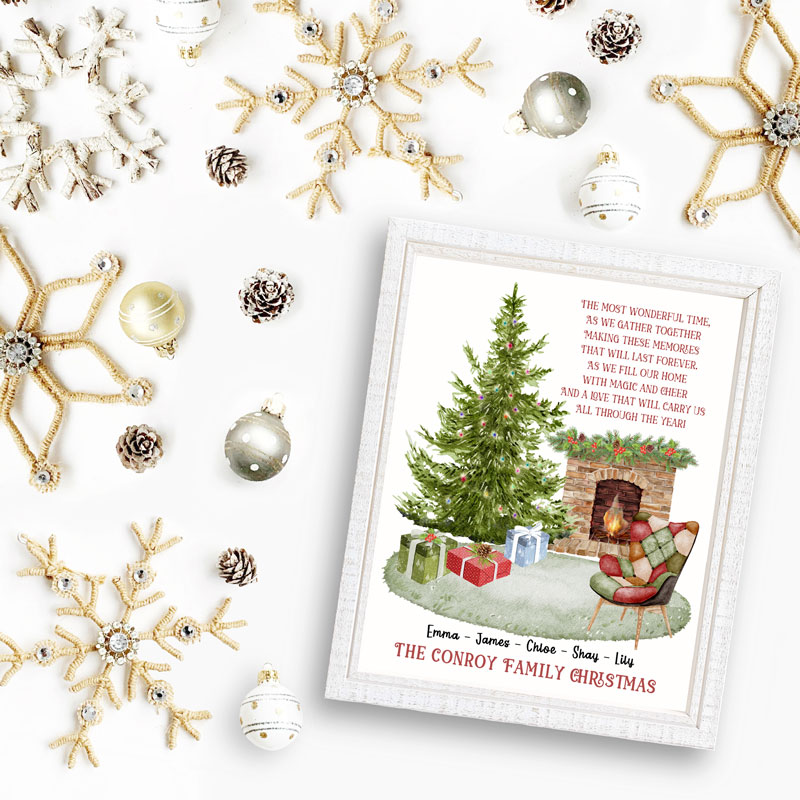 Novelty Christmas Family Print beautifully illustrated with a fireplace scene. A lovely frame to hang year after year. Personalised with family surname and first names.