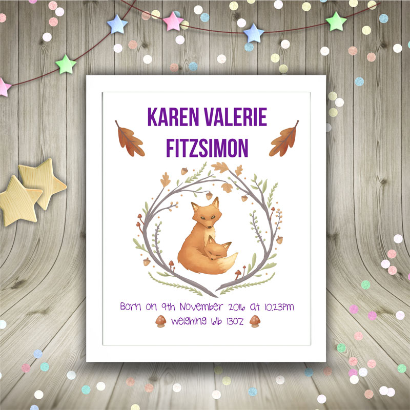 Framed Personalised Print for a new baby with Woodland Foxes design.