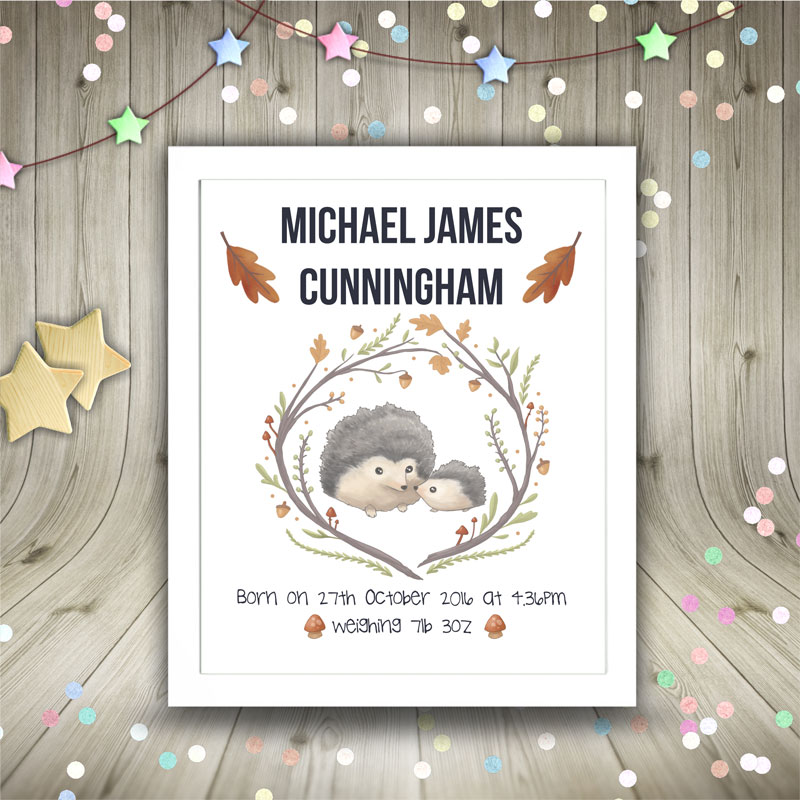 Framed Personalised Print for a new baby with Woodland Hedgehogs design.