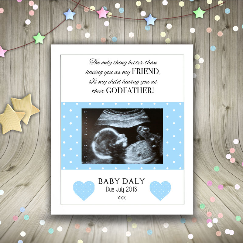 Upload a picture of your baby scan. You can add your own personalised greeting or use the greeting as per the picture “The only thing better than having you as my FRIEND is my child having you as their GODFATHER!”