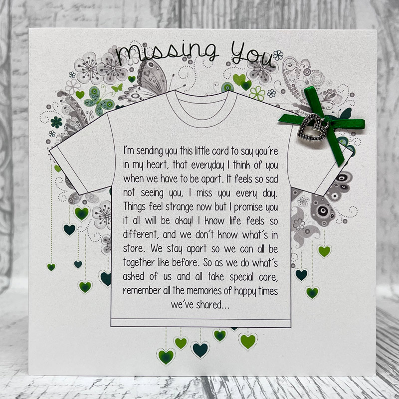 Sentimental Greeting Card for the current Covid 19 pandemic. This verse is ideal to tell someone that you are missing them at this time of staying at home, printed on pearlescent card with ribbon bow and heart charm.