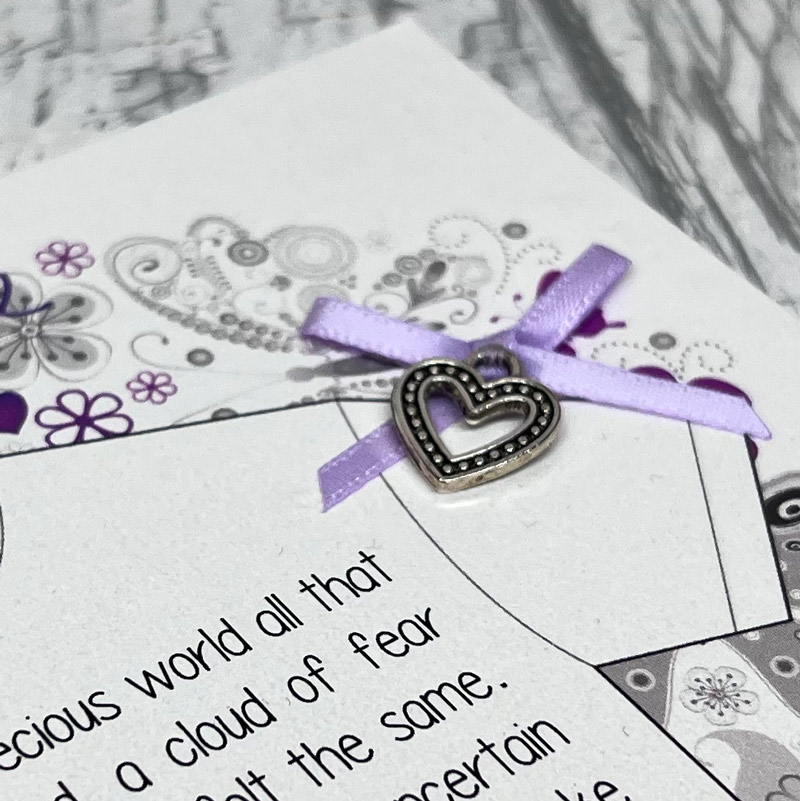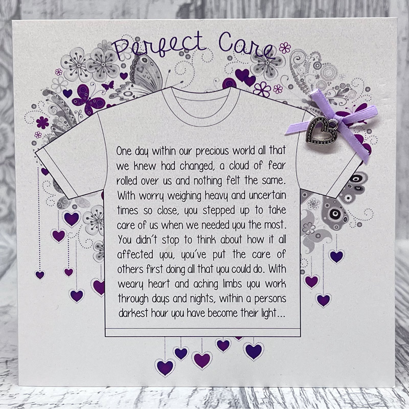 Sentimental Greeting Card inspired by the Covid 19 pandemic. This sensitive verse expresses gratitude to those who are providing care, printed on pearlescent card with ribbon bow and heart charm.