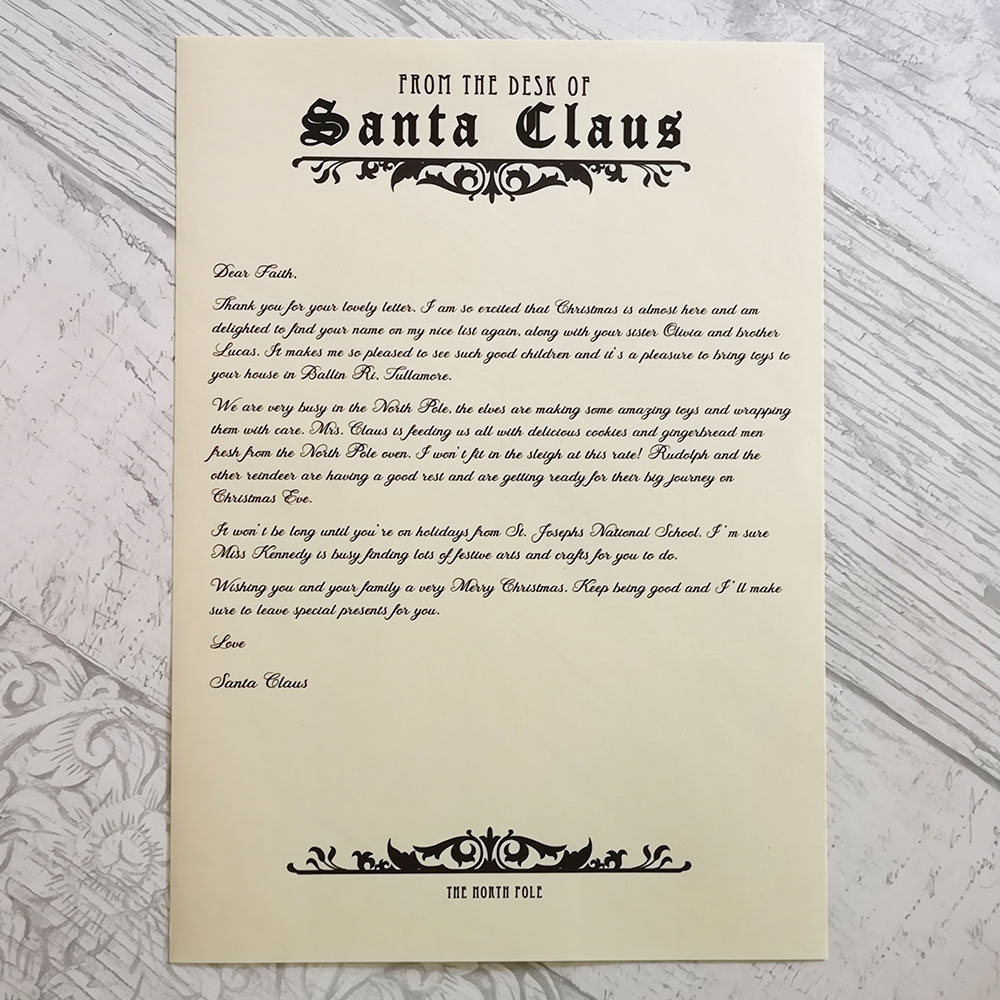 After the letter has been sent to Santa (ideally before start of December), they will receive the personalised envelope in the mail containing: A reply letter from Santa (NOT the letter with the wax seal), a personalised Nice Boy / Girl calendar with stars and a chocolate bar.