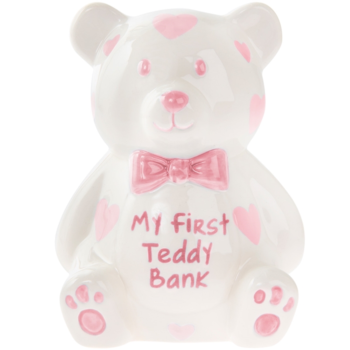 Product Description Ceramic glossy white teddy bear money box with pink design detail. Suitable for a baby gift.