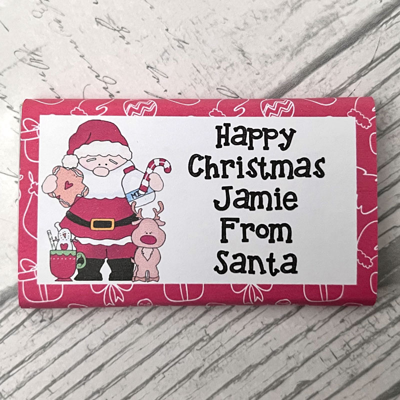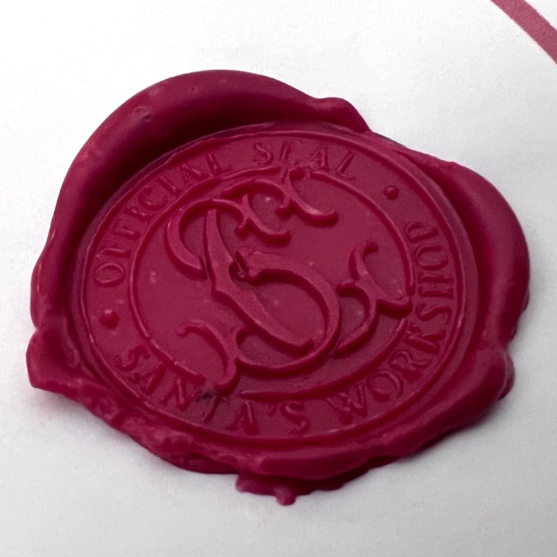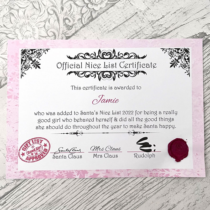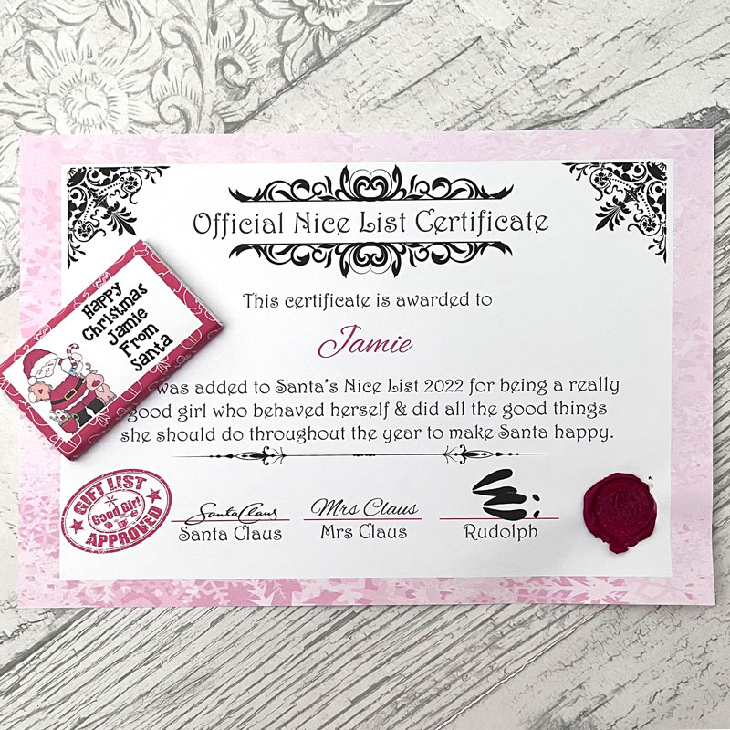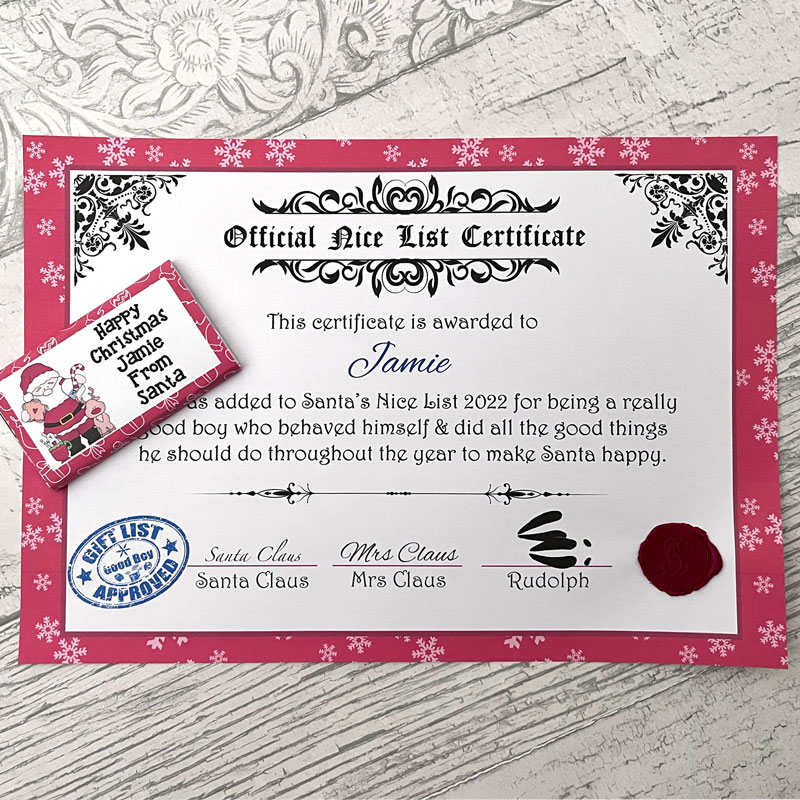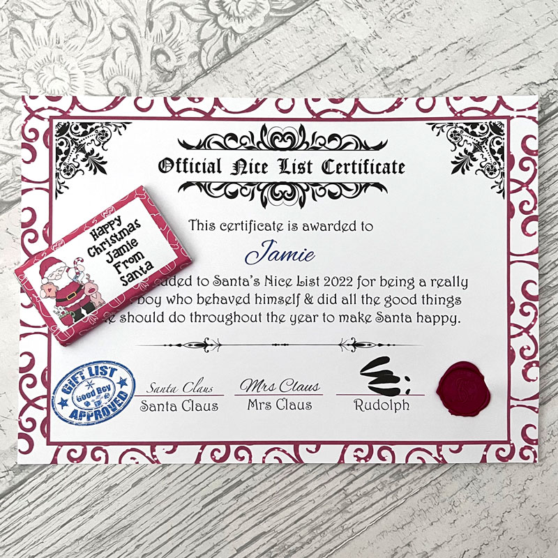 Personalised Nice Certificate with authentic SC wax stamp confirming a child has been added to Santa’s Nice List. Accompanied by a personalised chocolate bar from Santa.