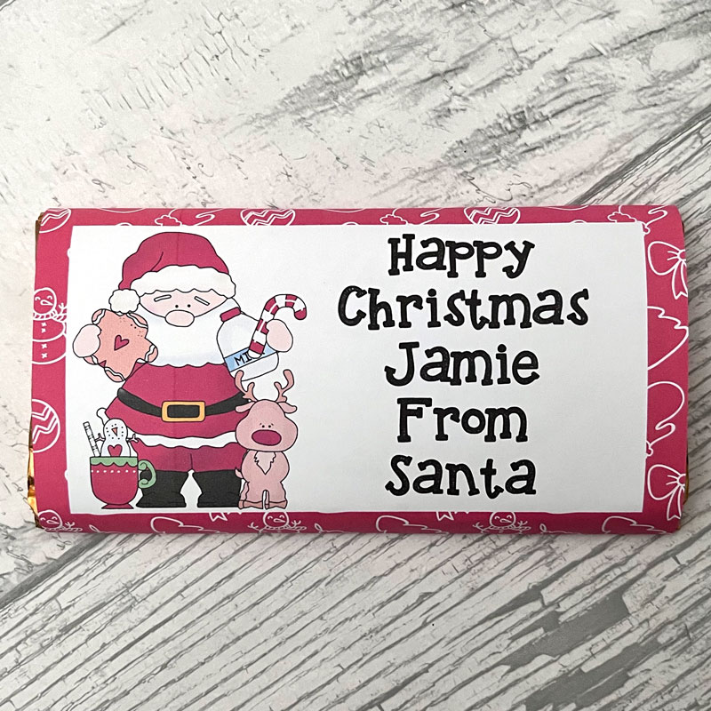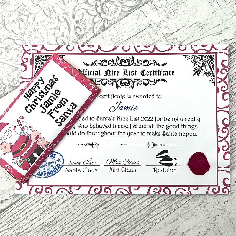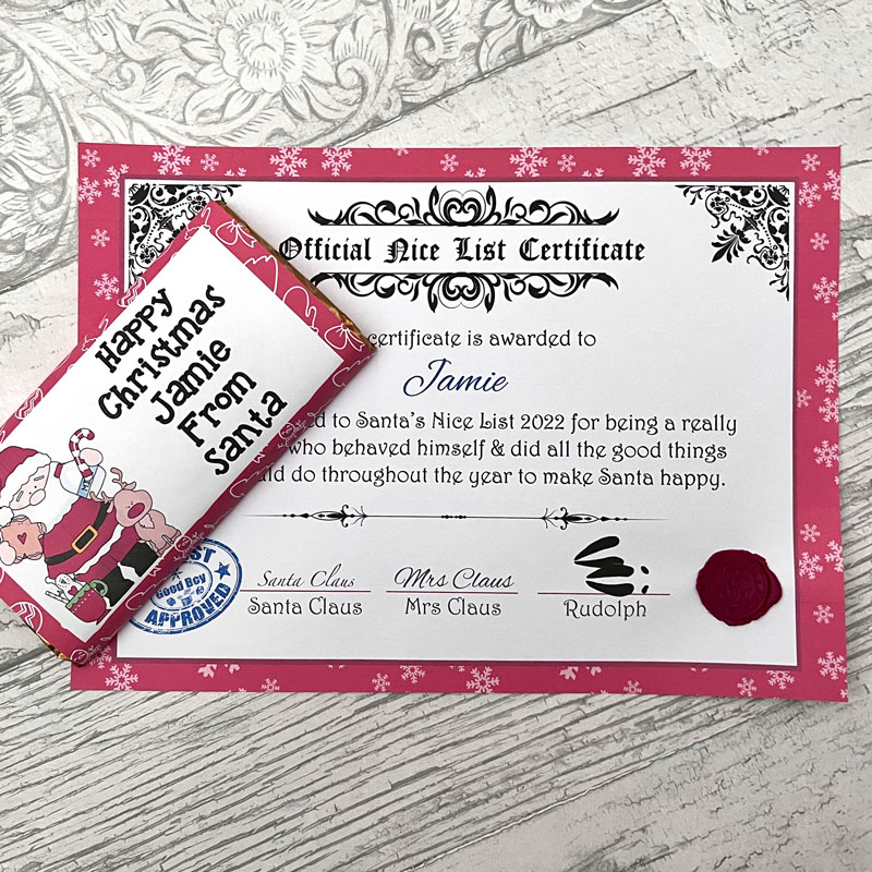 Personalised Nice Certificate with authentic SC wax stamp confirming a child has been added to Santa’s Nice List. Accompanied by a personalised large chocolate bar from Santa.