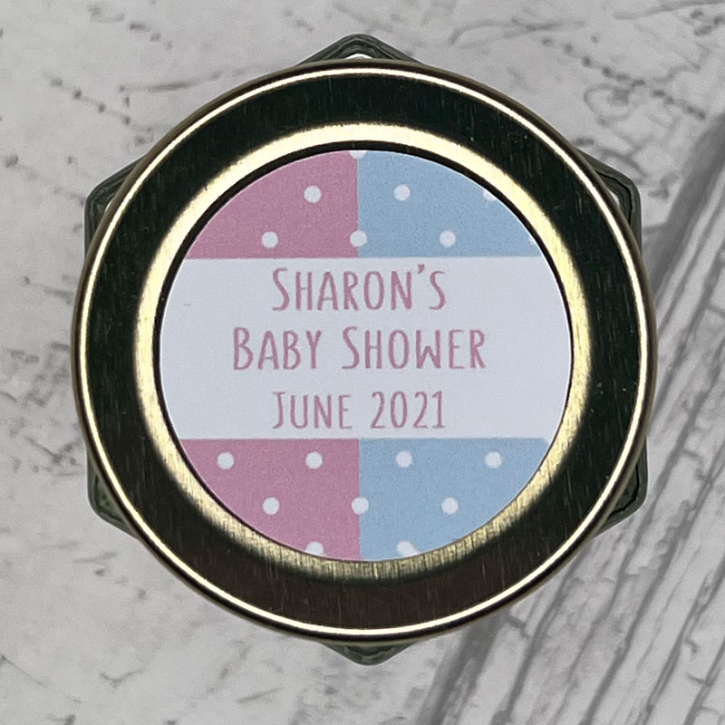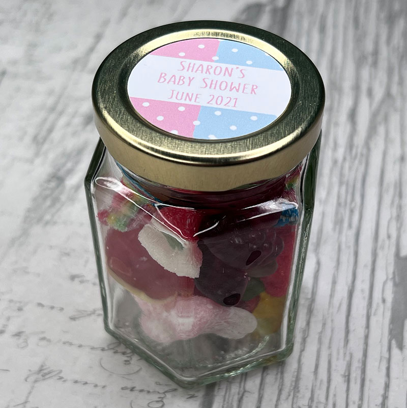 Personalised Sweet Jar with details of Baby Shower. Jar is supplied with a fill of mixed sweets or can be ordered empty for you to fill yourself.