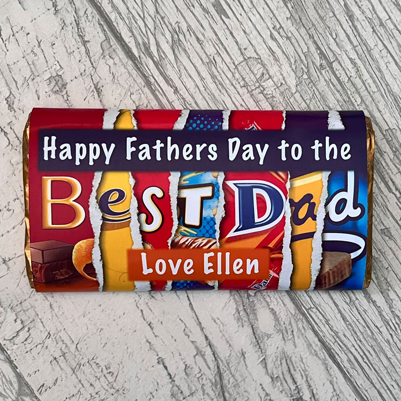 Personalised large chocolate bar with ripped chocolate bar wrappers design suitable for birthdays or Father’s Day. We use Galaxy Smooth Milk Chocolate.