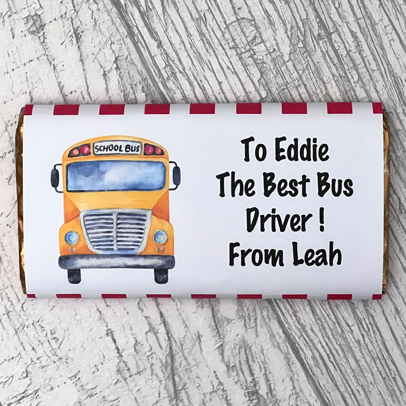 Personalised large chocolate bar with school bus design to thank a bus driver. We use Galaxy Smooth Milk Chocolate.