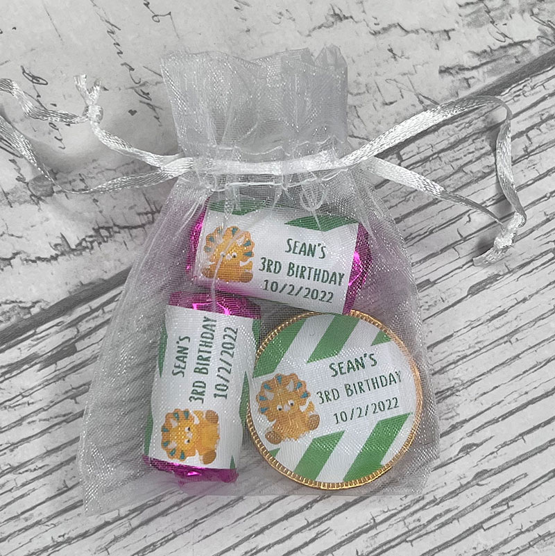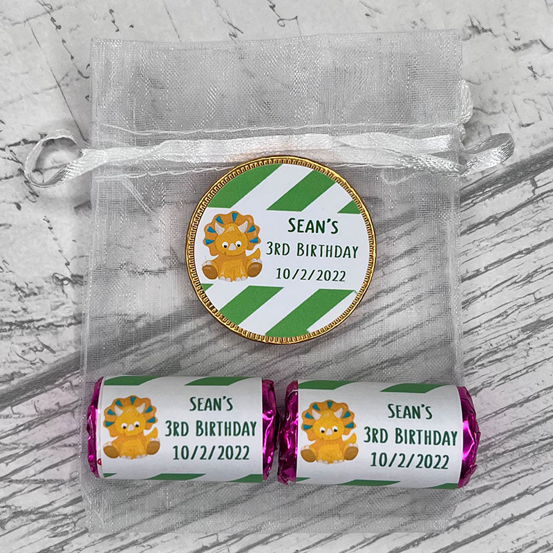 Personalised Milk Chocolate Coin and 2 mini Love Hearts with details of celebration in Organza Bag.