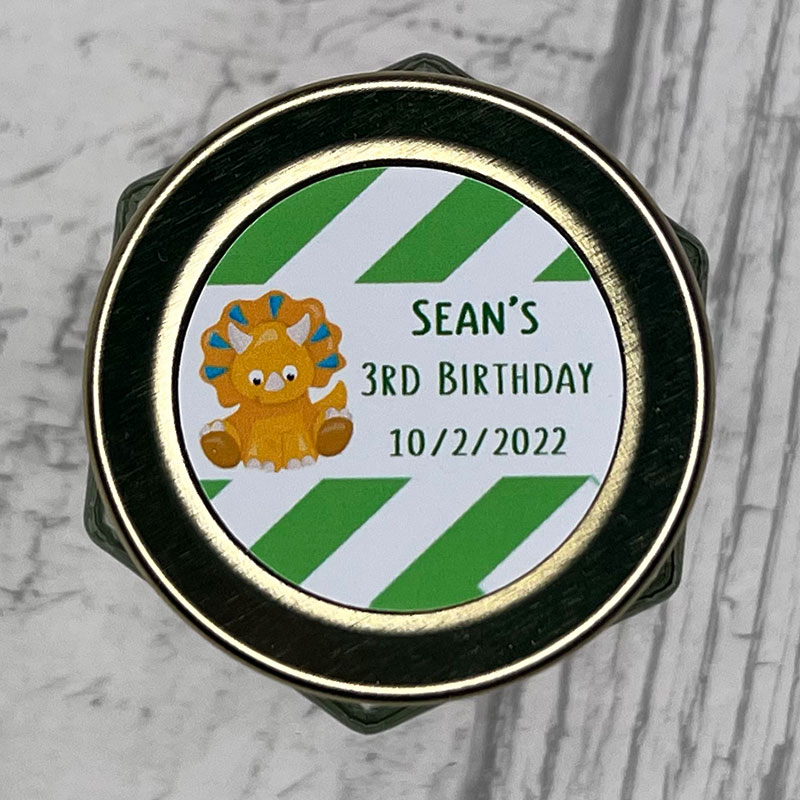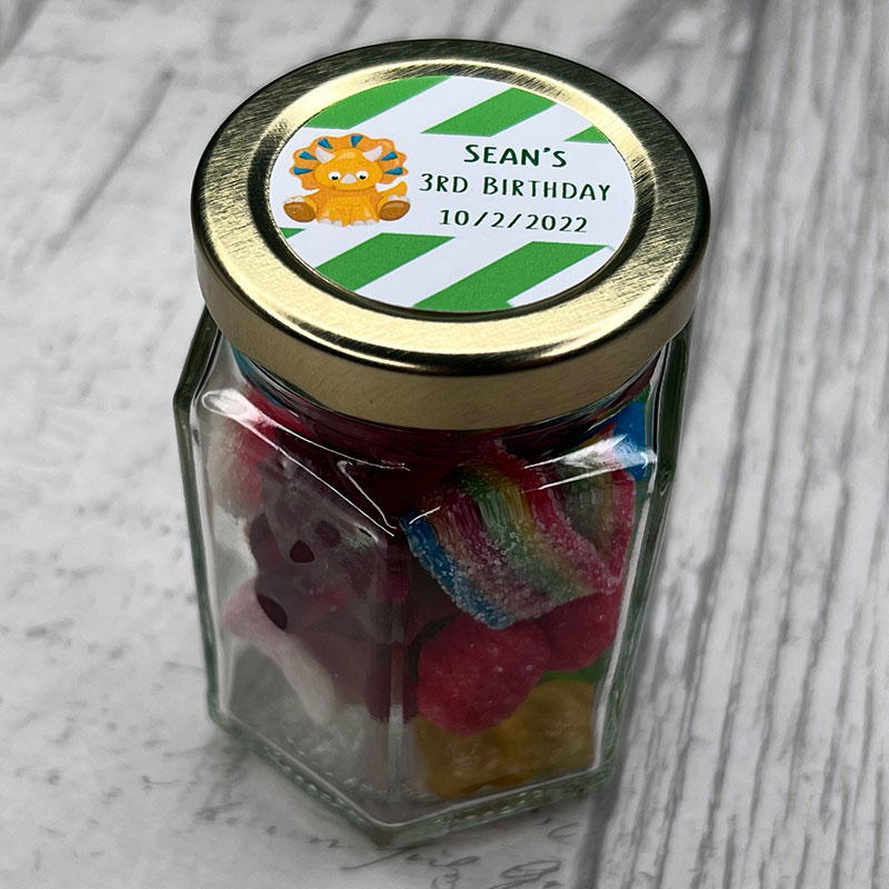 Personalised Child Dinosaur Theme Sweet Jar with details of celebration. Jar is supplied with a fill of mixed sweets or can be ordered empty for you to fill yourself.