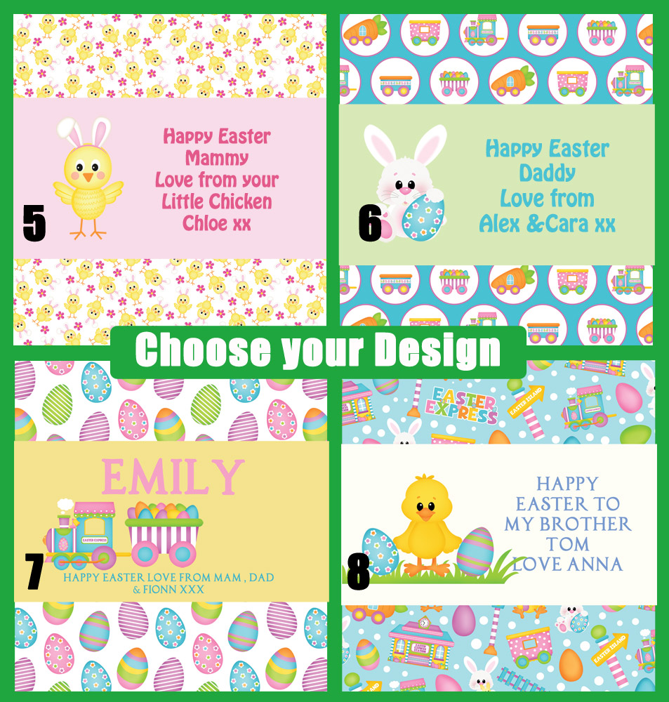 There is an option to add a large Easter chocolate bar, Small easter chocolate bar or medium easter egg. We use Galaxy Smooth Milk Chocolate (large bar), Animal Bars (small bar) and Cadburys Easter eggs.