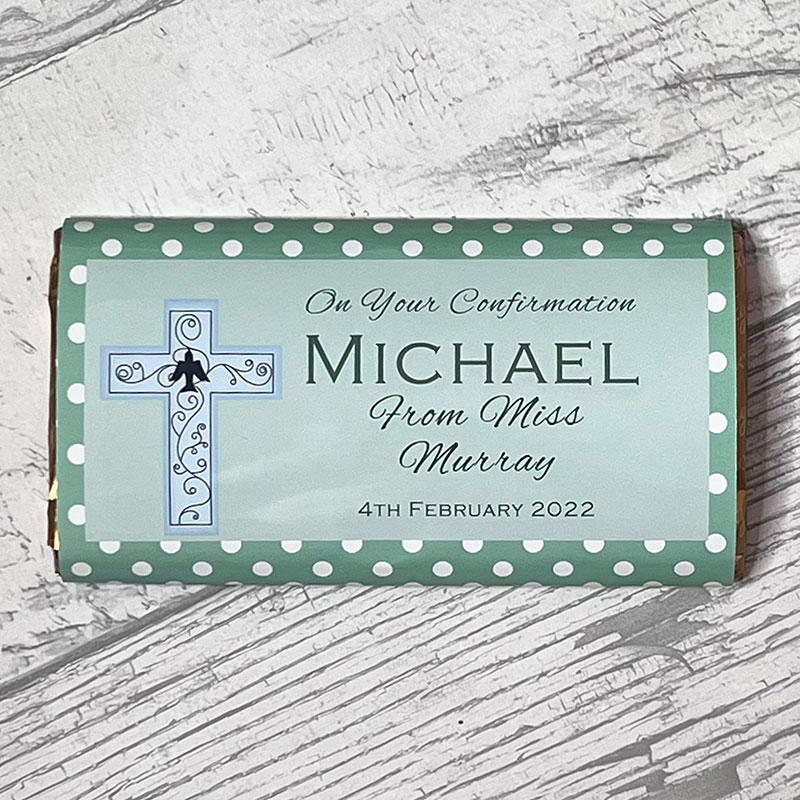Personalised large Confirmation chocolate bar with confirmation cross design. Background colour is green. We use Galaxy Smooth Milk Chocolate.