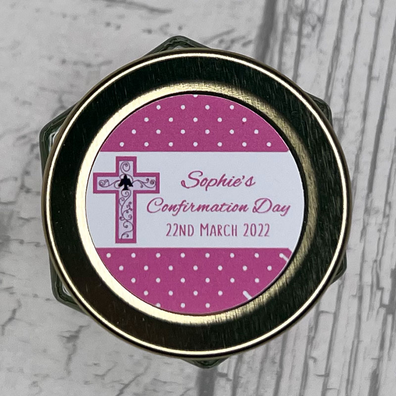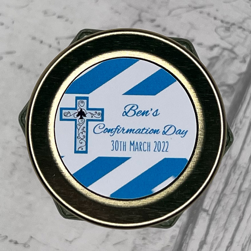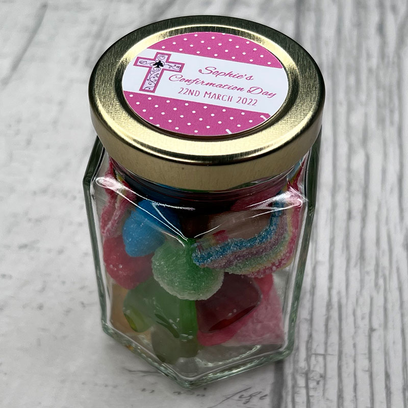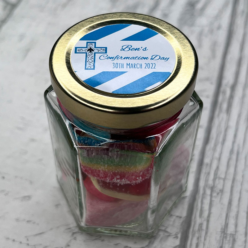 Personalised Sweet Jar with details of child’s confirmation day. Jar is supplied with a fill of mixed sweets or can be ordered empty for you to fill yourself.