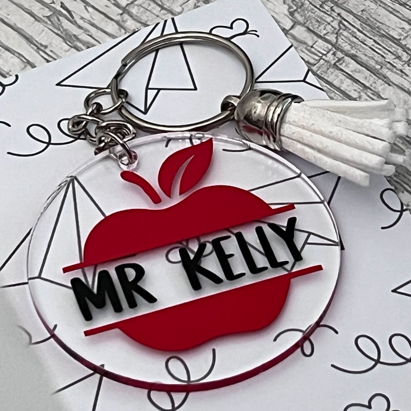 Personalised acrylic keyring with tassle. Features image of an apple with teacher’s name. Presented on gift card backing to add your own message.