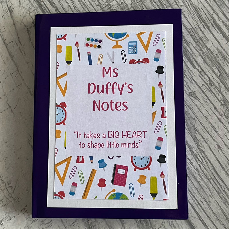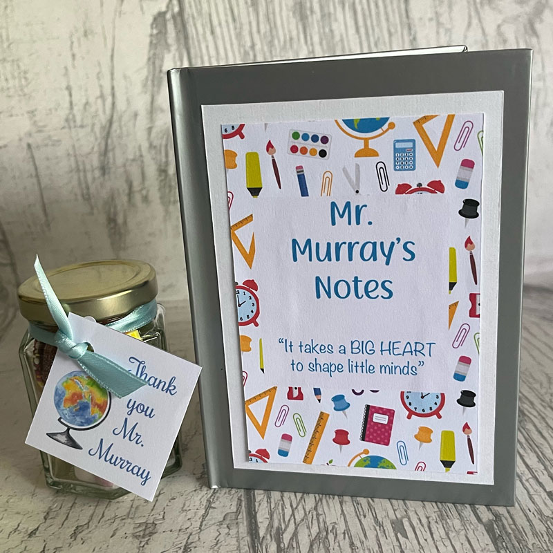 Personalised A5 Hardback Notebook and jar of sweets. Features teacher’s name on notebook and personalised tag on sweet jar.