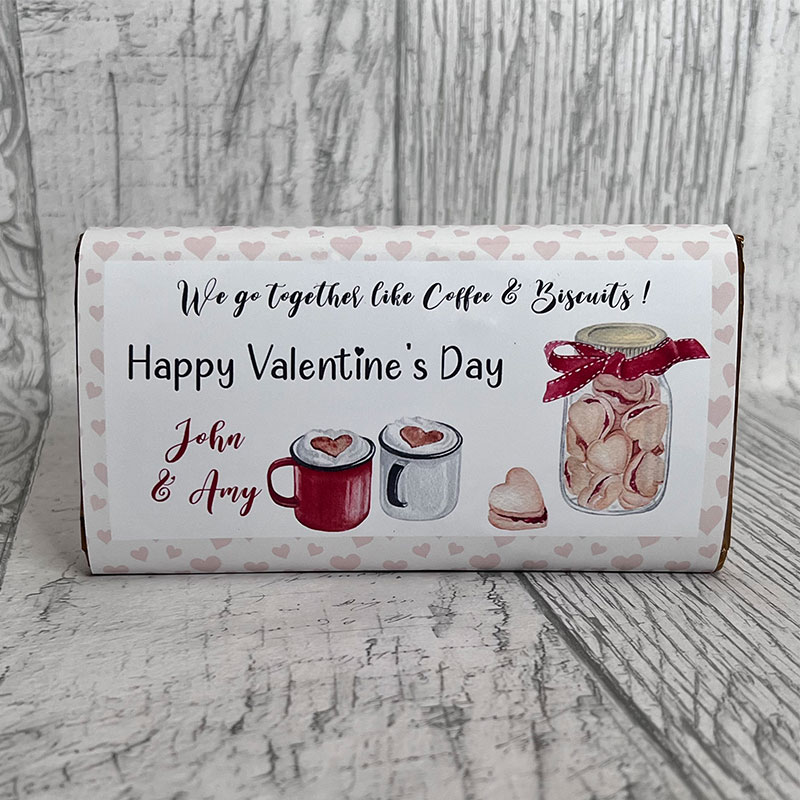 Personalised large valentines chocolate bar with “We go together like Coffee and Biscuits” design. We use Galaxy Smooth Milk Chocolate.