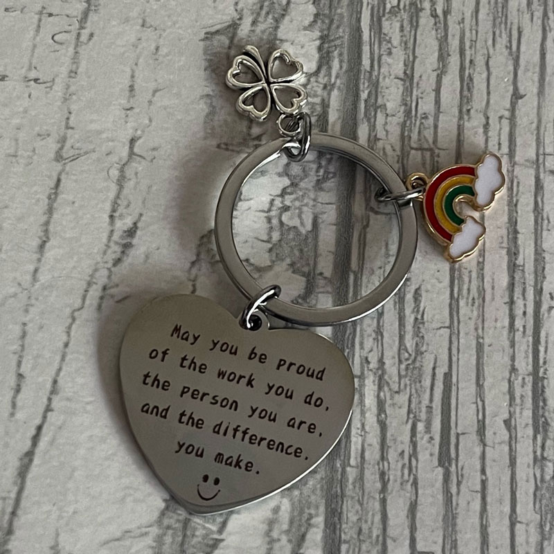 Large heart keyring with rainbow and four leaf clover charm. Heart is inscribed with the text: “May you be proud of the work you do, the person you are, and the difference you make.”